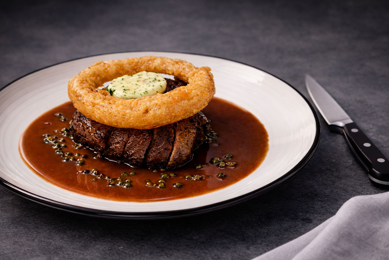Field mushroom, peppercorn sauce, onion rings, hand-cut chips, watercress salad GFA (FOR TWO TO SHARE)
