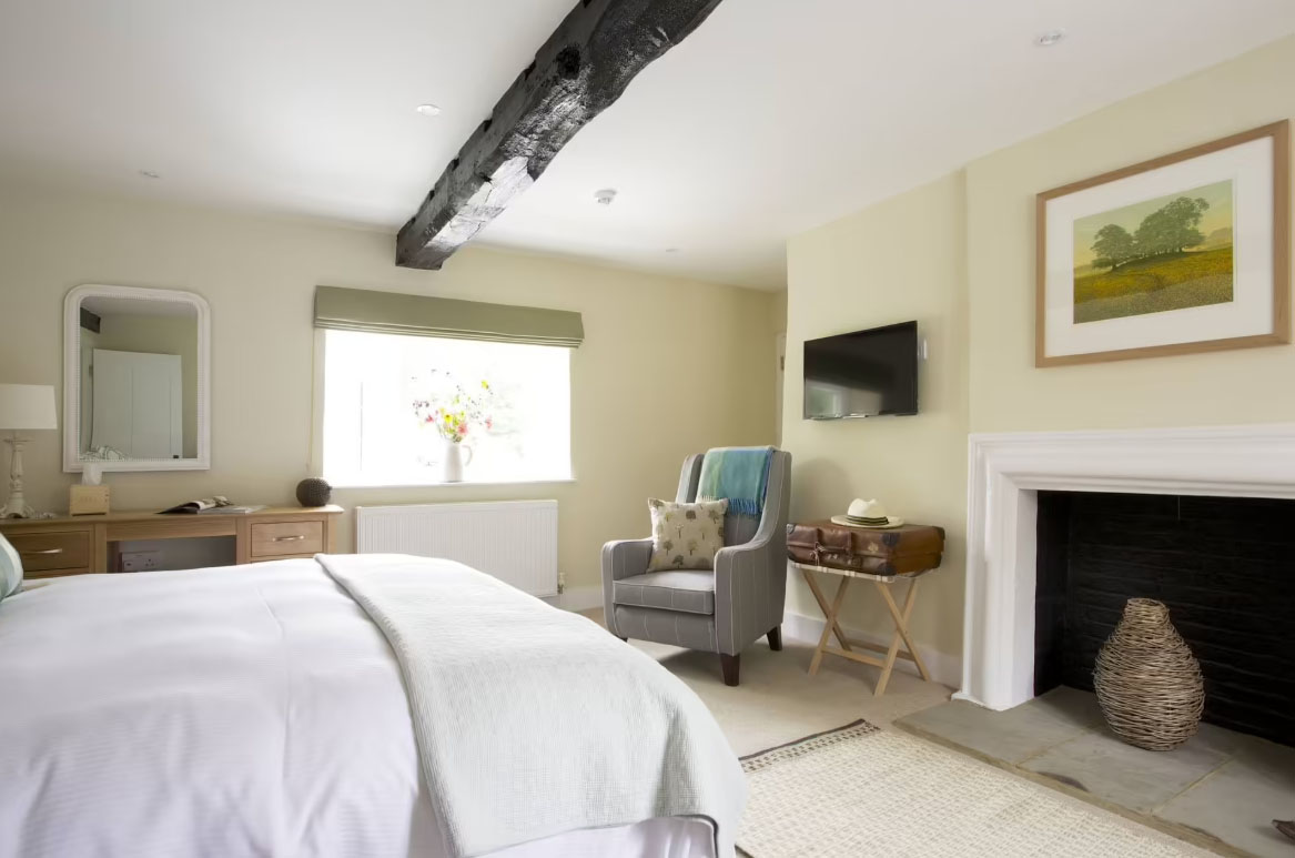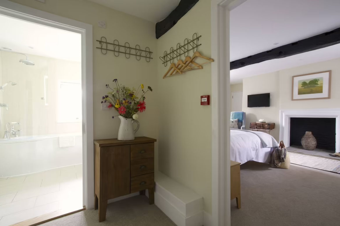 A beautiful hill on the chalk downs. Our largest room, with double aspect windows and gorgeous old beams. Win Green has a generous superking bed and ensuite bath and shower room. If needs be it can be twinned with neighbouring Wardour so that family members can move privately between the two rooms.